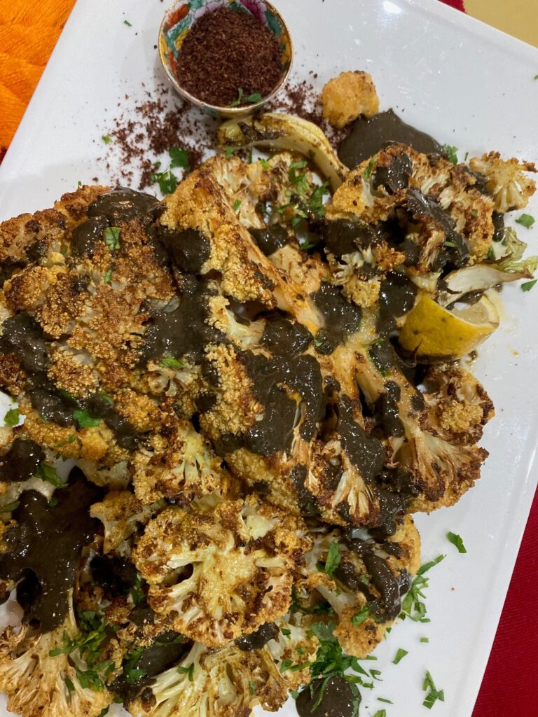 Plate the cauliflower, drizzle with the date molasses, then the tahina sauce. Garnish with the parsley and sumac. Serve hot or at room temperature.