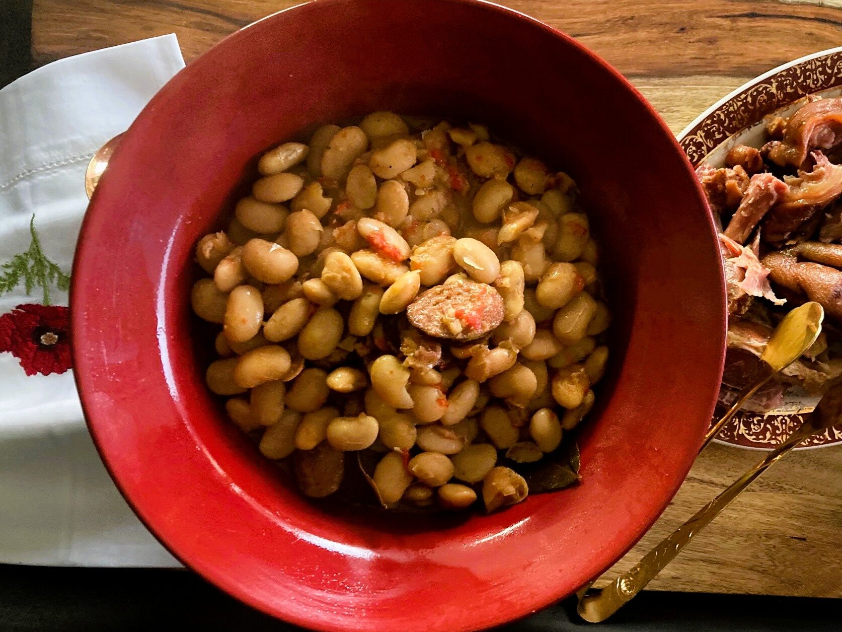 Drawing from Louisiana red beans and rice, this recipe utilizes large dried white beans for their substantial meatiness and ability to soak up flavors, smoked pork sausage, and a smoked ham hock to their full potential.  Soak the dried beans overnight before starting, cook slow and steady, then all that is needed is the accompaniment of cooked rice, and maybe some sliced fresh cayenne and a ‘lil splash of vinegar, as you prefer.